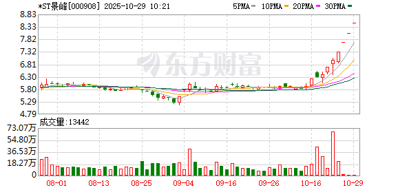 *ST景峰再度涨停,9个交易日内录得6个涨停,累计涨幅为42.83%,累计换手率为22.86%。截至9:27,该股今日成交量75.33万股,成交金额638.08万元,换手率0.09%。最新A股总市值达74.52亿元。